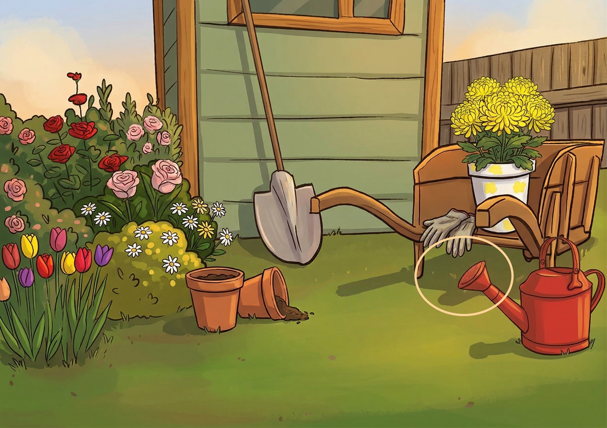 The one mistake in the picture is that the red watering can is physically impossible to use.