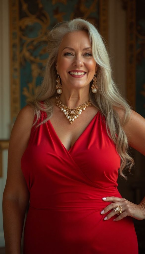 Her name was Evelyn, forty-two, a woman with a history of restrained charm and mischievous glances. She had learned the power of suggestion early on, knowing how to communicate volumes without saying a word. Tonight, her dress dipped just enough to reveal the pale, smooth skin above her chest, framing her collarbone like a piece of art. Jason’s eyes lingered, a magnetic pull he couldn’t resist.
